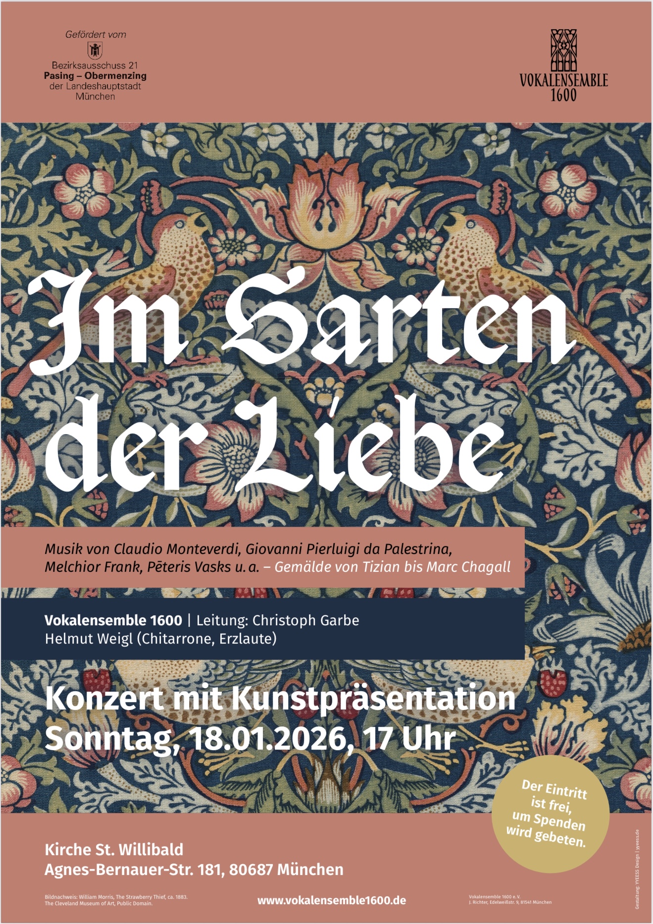 Das Vokalensemble 1600 dankt für die Unterstützung durch das Bayerische Staatsministerium für Wissenschaft und Kunst und durch das Kulturreferat der Landeshauptstadt München.